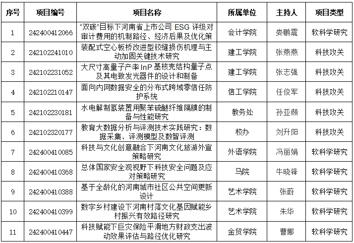 根据《关于下达河南省二〇二四年科技发展计划的通知》(豫科〔2024〕42号),我校11项2024年河南省科技厅项目获批立项,其中科技攻关项目5项,软科学研究项目6项。这是我校实施“有组织科研”以来,强化科研管理、加强团队建设、丰富学术交流、激发科研创新活力取得的新突破。望各课题组认真组织、科学分工、协同创新、保障项目研究工作顺利开展。