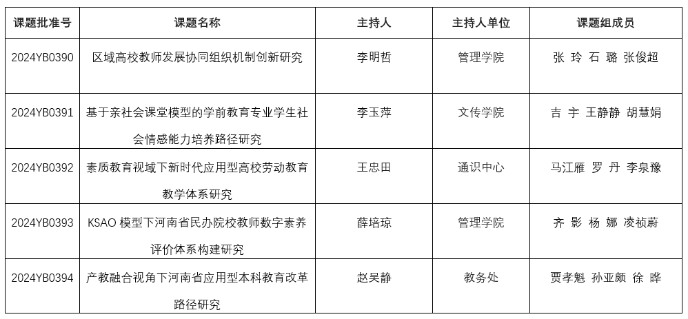 根据河南省教育厅办公室《关于公布河南省教育科学规划2024年度一般课题立项名单的通知》(教办教科〔2024〕165号)文件,我校5项河南省教育科学规划2024年度一般课题获批立项。请各负责人认真组织实施,在规定时间内保质保量完成课题研究。