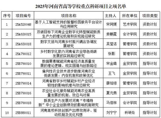 根据《河南省教育厅关于公布2025年度河南省高等学校重点科研项目计划立项的通知》(教科技〔2024〕315号),我校10项课题成功立项(其中资助类计划4项,指导类计划6项)。立项总数量在省内21所民办本科高校中位居第三。
