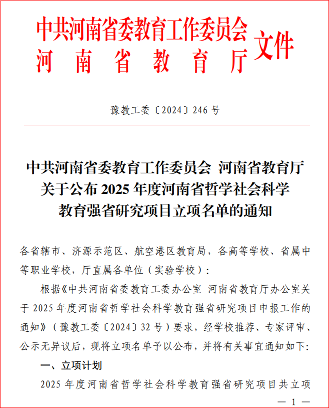 根据《中共河南省委教育工作委员会 河南省教育厅关于公布2025年度河南省哲学社会科学教育强省研究项目立项名单的通知》,我校11项2025年度河南省哲学社会科学教育强省研究项目获批立项,其中基础研究项目7项,专项研究项目4项,立项总数位居全省民办高校前列。