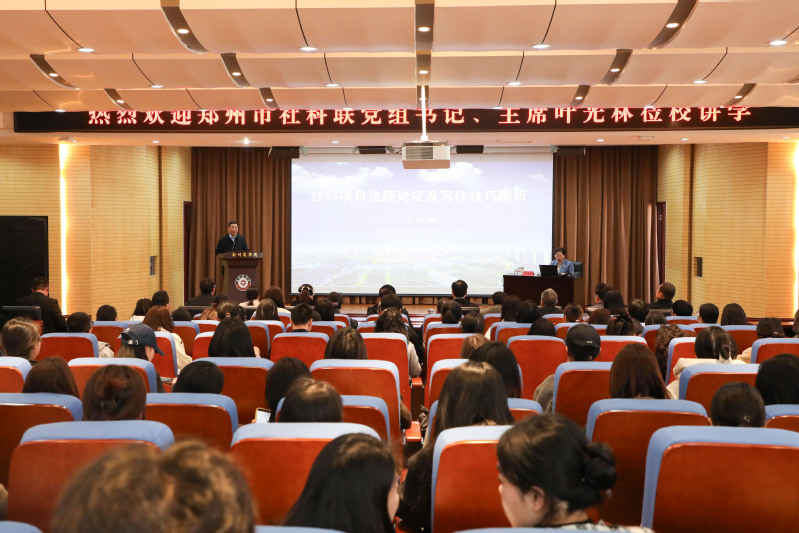 为深入贯彻落实期初全体教职工大会精神,持续推进“学术郑商”建设,拓宽我校教师学术视野,加强人文社科领域交流与学习,3月20日,郑州市社科联党组书记、主席叶光林莅临我校,在图书馆5楼学术报告厅作了题为《社科项目选题论证及写作技巧解析》的学术报告。校长吴泽强、副校长兼工会主席张江涛、校属各教学科研单位负责人、全体科研联络员和青年科研骨干教师代表共计200余名教工参加了本次报告会。
