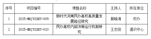 根据河南省教育厅办公室发布的《关于民办教育专项课题研究项目立项和结项名单的公示》我校河南省民办教育专项课题获批立项2项,立项数量位居省内民办高校第二。这一成绩的取得,是我校长期坚持“学术郑商”建设、积极开展有组织科研工作的成果体现。望各课题组认真组织、科学分工、潜心研究,确保高质量、高效率地完成项目研究任务,为推动我校科研工作的发展做出新的贡献。