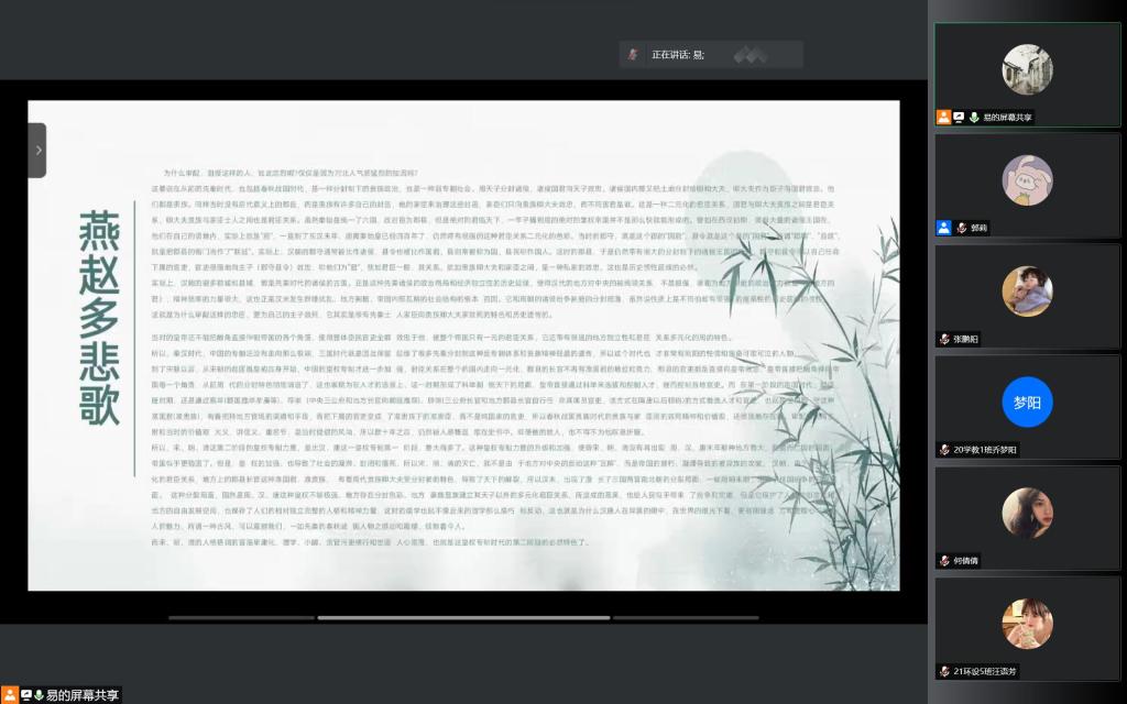 4月7日晚,由图书馆主办、郑商书友会协办的“我的读书故事”校园巡讲活动第十四期在腾讯会议成功举办。本次巡讲采取线上直播的方式向大家分享了两本书籍,分别由文传学院20汉本1班张艺琛分享《潇水演义真三国》、艺术学院20环设2班王梦珂分享《不抱怨的世界》。
