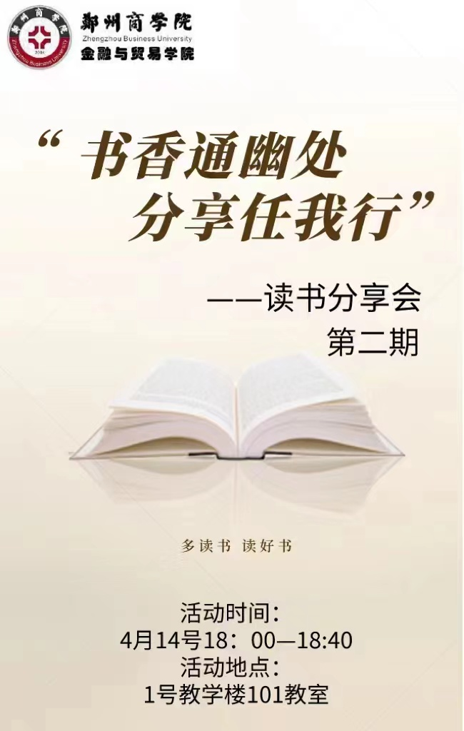 为持续推进金贸学院书香校园建设,营造浓厚的学习氛围,提升青年学生学习动力。我院于4月14日在1号楼101教室开展“书香通幽处,分享任我行”读书分享会活动。此次活动由金贸学院读书分享宣讲团成员共同参与。此次活动的顺利开展,进一步激发了学生的阅读热情,锻炼了学生们的表达能力。让学生感受到了阅读的魅力,对同学起到了积极的作用,促使学生养成终身阅读的习惯,加强道德修养、坚定理想信念、提升精神境界,为我院“书香校园阅读经典工程”建设奠定了坚实基础。