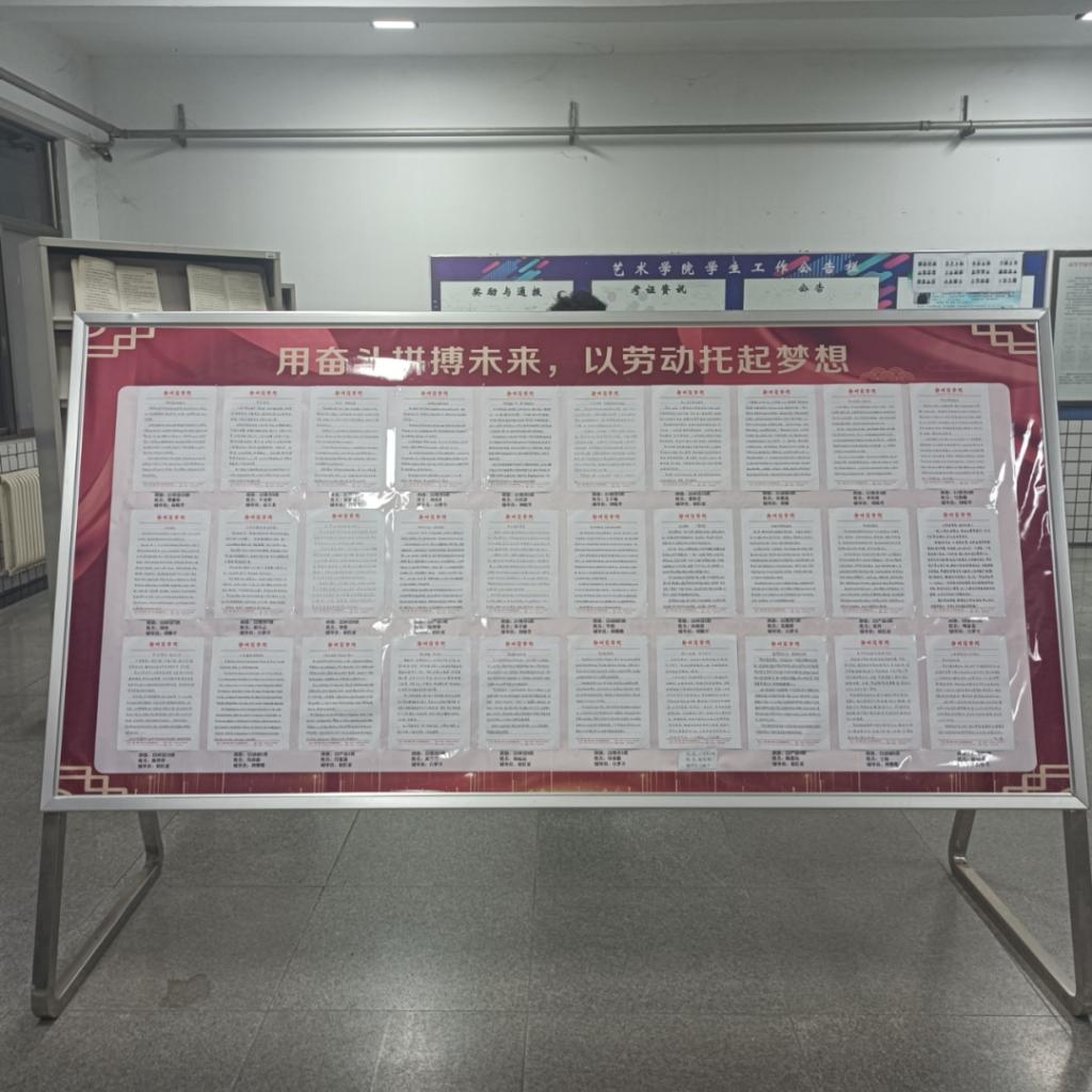 为了在学生中弘扬劳动精神,让学生知道崇尚劳动、尊重劳动的道理,能够辛勤劳动、诚实劳动、创造性劳动,艺术学院于11月14日举办“以劳增智,书写你眼中的劳动教育”征文作品展,将优秀征文作品在艺术楼一楼大厅进行展览,让大家学习劳动模范事迹,深刻领悟劳动模范精神,培养正确的劳动价值观。