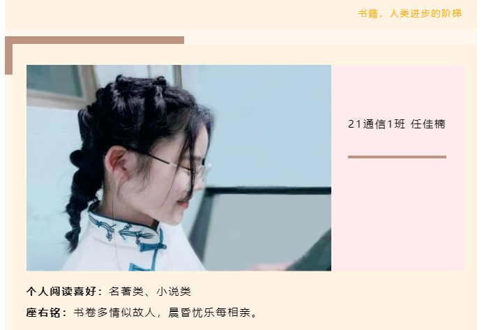 11月14日,为积极营造信工学院“多读书、读好书、会读书”的良好氛围,使广大学生养成终身学习的良好习惯,信工学院特推出“我与阅读的故事”读书达人风采展。此次风采展主要对我院各班级中热爱读书的同学进行展示,树立读书榜样,以榜样力量助力学生成长。此活动激发学生读课外书的兴趣,充分调动学生阅读的积极性和主动性,丰富学生的学习生活,为每一位学生提供展示自己的平台。