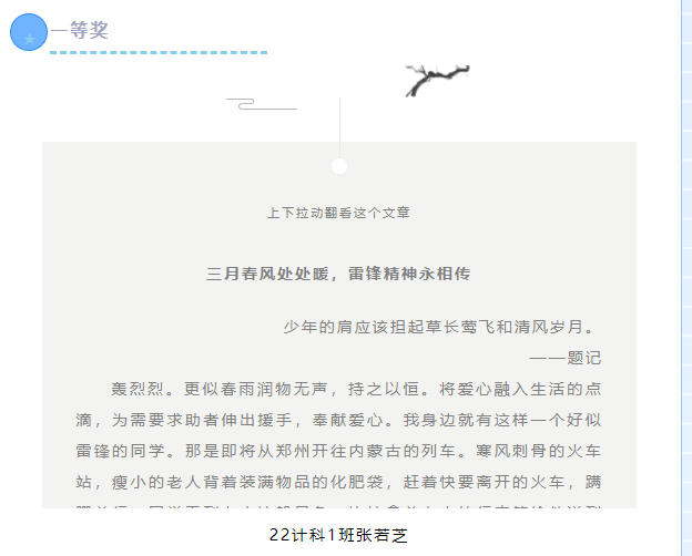 为深入学习贯彻党的二十大精神,积极营造信工学院的书香氛围,促使学生学习雷锋精神,用身边雷锋的事迹鞭策自己、督促自己,形成奋发向上的精神力量,3月2日至8日,信工学院特举办“春风十里,最美是你——身边的雷锋”征文活动。本次比赛,选手们通过记叙文、诗歌、日记等不同的文体,围绕“春风十里,最美是你——身边的雷锋”这一主题进行撰写,通过不同视角,多方位、多层面追忆雷锋事迹,宣传身边雷锋典型,诠释了新时代雷锋精神的丰富内涵,在字里行间充分展现了我院学生积极、健康、向上的精神风貌。