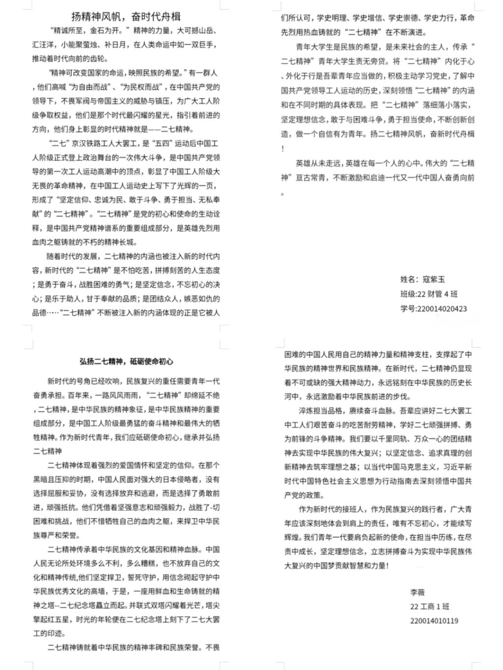 为落实我校“书香校园阅读经典工程”建设,讲好红色故事,3月22日至26日,工商管理学院举办以“二七精神”为主题的征文比赛。这次活动不仅提高了学生写作水平和文化素养,还有助于引导学生坚定不移听党话、跟党走,同时,丰富了我院学子的校园文化生活,营造了浓厚的书香氛围。