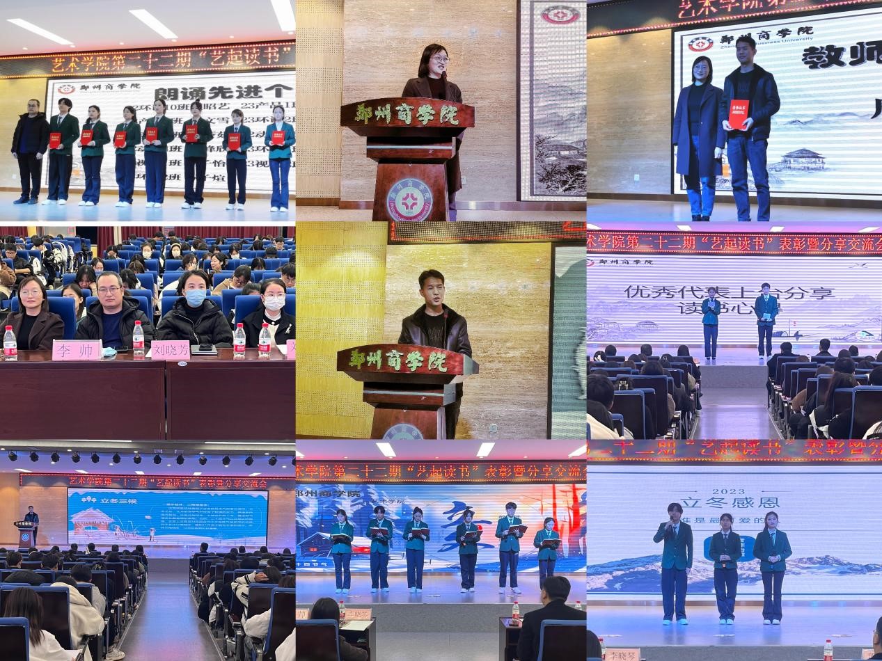 为落实学校书香校园阅读经典工程建设的要求,不断形成“三全育人”的良好格局,实现学生“知识、能力、人格”的协调发展,艺术学院于12月6日晚在自力楼三楼报告厅开展2023年书香校园阅读经典工程启动仪式暨第二十二期“艺起读书”表彰暨分享交流会。图书馆馆长李晓琴、艺术学院党委书记李帅、团委书记殷晴波、全体辅导员和学生代表参与了本次活动。本次活动开阔学生的视野,丰富学生的精神世界,提高同学们的专业素养和人文素养,收获与感恩,营造了良好的书香氛围,凸显我校育人成效,培育和践行社会主义核心价值观,让学生了解立冬传统知识,感知中华文化的悠久历史,同时让大家感受爱、学会爱,学会识恩、知恩,从而善于施恩,并增强学生把感恩之情,化为学习中自强不息、顽强拼搏的励志精神。