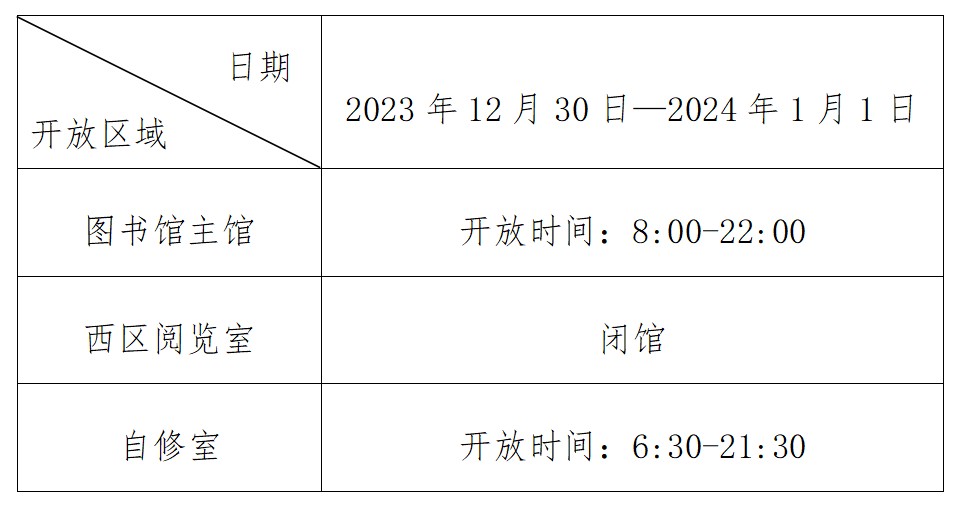 根据学校通知,2023年12月30日—2024年1月1日为元旦假期。为方便假期读者借阅,图书馆元旦假期开放时间如下: