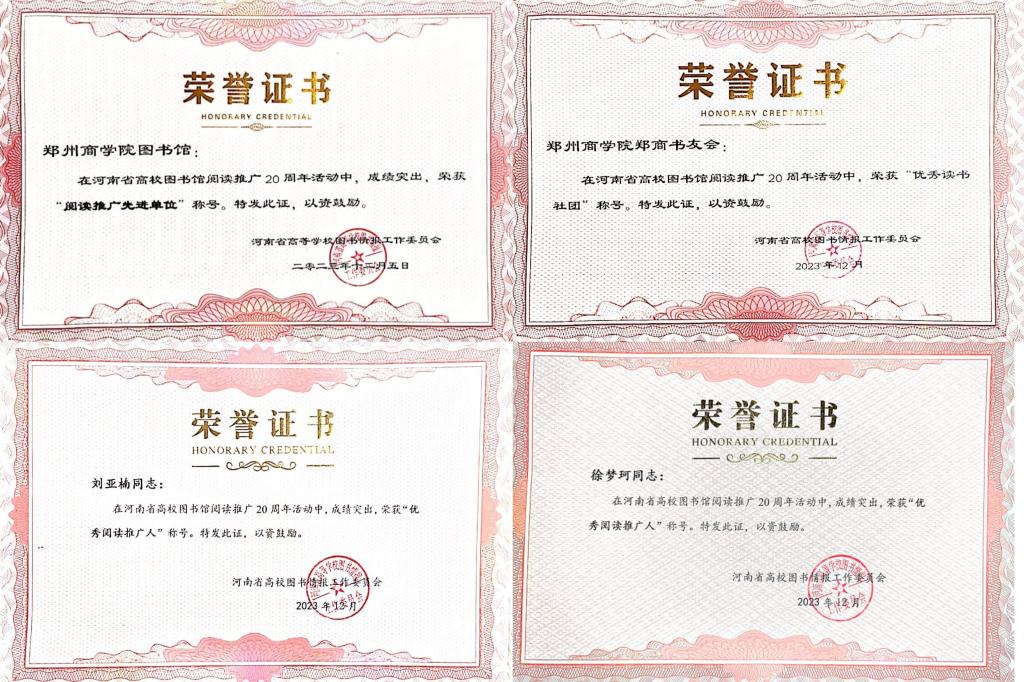 12月15日,由河南省高校图书情报工作委员会主办的河南省高校图书馆阅读推广20周年总结表彰大会在郑州大学图书馆成功举办。我校图书馆荣获“河南省高校阅读推广先进单位”,书友会荣获“河南省高校图书馆阅读推广优秀读书社团”,刘亚楠、徐梦珂老师荣获“优秀阅读推广人”等称号。