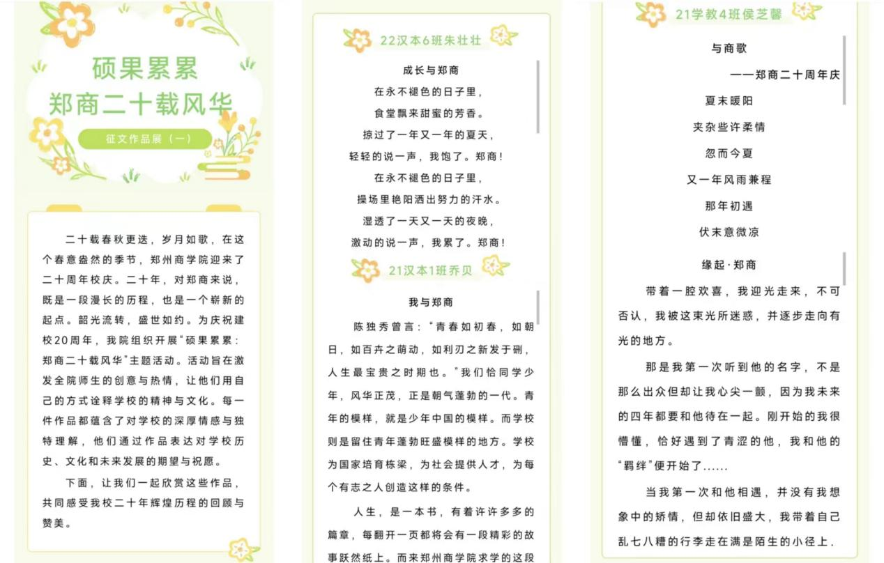 为推动我院书香校园阅读经典工程的建设,打造书香型校园,我院于4月2日特推出“硕果累累:郑商二十载风华”征文活动展。共选出三位优秀征文代表:21学教4班候芝馨、22汉本6班朱壮壮和21汉本1班乔贝同学,本次活动以庆祝郑商20周年为主题,同学们积极参与征文创作,意在倡导文传学子感恩母校,共庆二十周年,为日后书香工作的开展起到良好的标杆作用。