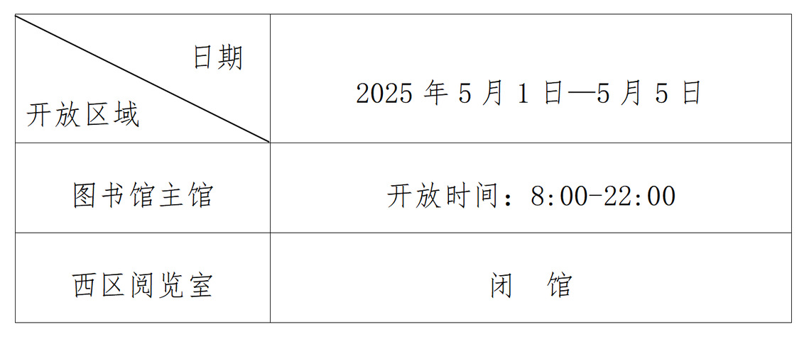 根据学校通知,2025年5月1日—5月5日为“五一”国际劳动节假期。为方便假期读者借阅,图书馆假期开放时间如下: