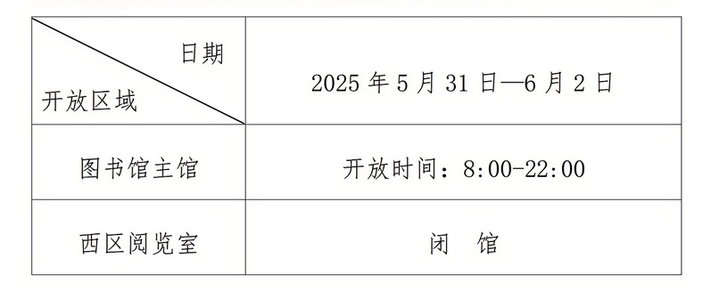 根据学校通知,2025年5月31日—6月2日为端午节假期。为方便假期读者借阅,图书馆假期开放时间如下: