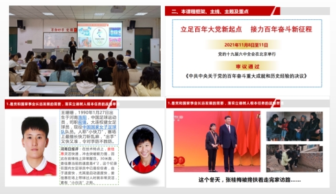 各教研室积极贯彻、认真落实通知要求。“概论”教研室张洁菲老师在开学第一课中,把抗击疫情、共同抗洪以及冬奥会、冬残奥会、中国女足等体现出来的中国人民团结一心、不懈奋斗精神与课程的教学目标相结合,更加落实立德树人根本任务;同时深入挖掘、发挥、强化冬奥会、中国女足的育人功能,运用河南榜样王珊珊、娄佳慧在训练过程中面对挫折永不放弃的事例去感染学生,十九届六中全会中中国百年奋斗历程又与课程框架相互联系,梳理课程框架过程中带领学生回顾党的百年奋斗历程,打造一堂有内涵、有温度、有分量的“开学第一课”,引导学生们树立正确的人生观、价值观,更加坚定中国道路自信和文化自信,将个人梦想融入体育强国梦与民族复兴梦中,让中国精神领跑新学期。