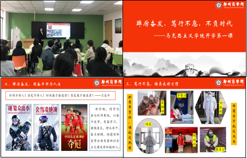 “原理”教研室段丽肖老师从三个层面设计课堂:首先,积极用习近平新时代中国特色社会主义思想铸魂育人、启智润心,结合百年奋斗经验、十九届六中全会精神,引导学生增强“四个意识”、坚定“四个自信”、做到“两个维护”,坚定理想信念,厚植学生爱国情怀;其次,深度挖掘冬奥精神,把冬奥会中展现的爱国情怀、文化自信、体育精神等鲜活素材带进开学思政第一课的课堂,培养学生奋斗精神,激励学生以奋斗追梦,发奋学习,做德智体美劳全面发展的社会主义建设者和接班人;最后,勉励学生以郑商优秀学子为榜样,培养良好习惯,用崭新的风貌书写不负时代的青春之歌!