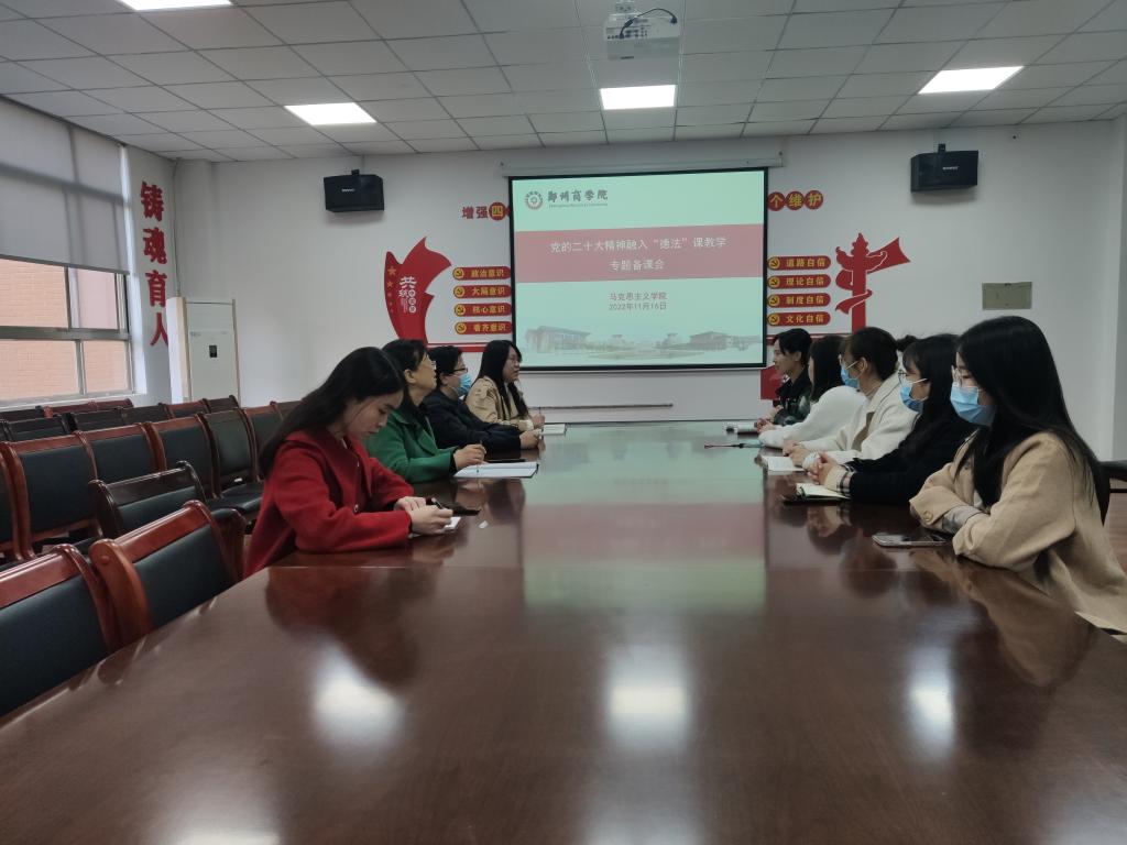 为更好地将党的二十大精神融入“德法”课课堂,加强新时代思想政治理论课建设,“德法”教研室于11月16日上午在我院会议室召开了党的二十大精神融入课程教学专题备课会。本次会议由教研室主任杨丽丽老师主持,全体无课教师共同参加了本次会议。