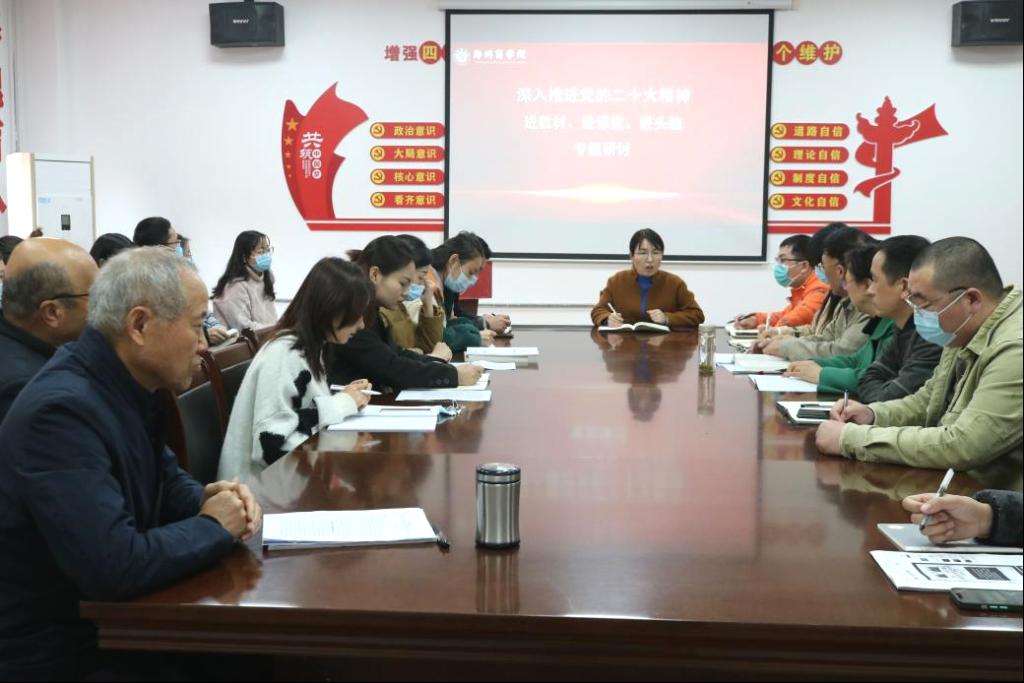 为进一步提高我院思政课教师理论水平和教学能力,深入推进党的二十大精神进教材、进课堂、进头脑。11月17日下午,我院组织开展推进党的二十大精神“三进”工作研讨会,会议由我院院长张党诺主持,全体无课教师参加。