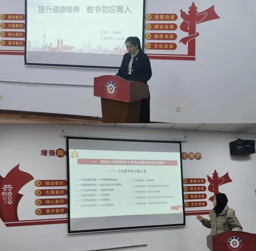 转训会上,王丁老师分享了学习中国特色社会主义文化建设方面的心得体会,通过寒假培训,王丁老师对新时代文化建设取得的成就有了较为系统的认知,理解了中华文化时代精华论的深刻蕴含;我们所处的时代,是一个文化战略纷出的时代,只有构建文化优势,才能不断推进社会主义现代化强国建设。在教师授课该部分内容时,一定要认清当前形势,讲清楚文化的地位和作用,使学生更清晰了解构建中国特色社会主义文化优势的重要性。