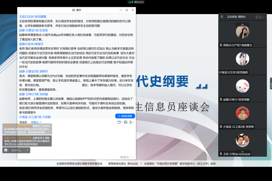概论教研室座谈会由青年教师张菡滟主持。座谈会上,各位学生信息员畅所欲言,与会同学普遍认为,“概论”课教师教学态度认真,教学内容充实,教学方法灵活,教学手段多样,智慧化平台使用得当,有效调动了同学们的学习兴趣。同时,同学们也结合所在班级的听课状态及自身学习体会,围绕强化师生互动,提高学生参与度,加强课堂管理等方面,对改善“概论”课教学提出了许多宝贵的建议。最后,张菡滟老师对此次座谈会进行总结,感谢各位信息员提出的宝贵建议,教研室将予以认真研究,并及时反馈给各位任课老师,以进一步提升教师的教学能力与教学水平,更好地完成教学任务和教学目标。