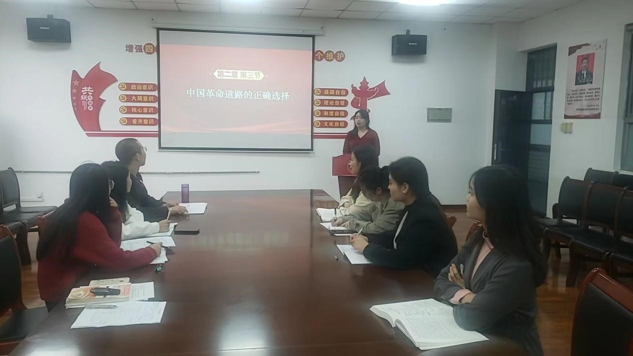 首先,由江琳琳老师就第二章第三节“新民主主义革命的道路”的相关内容进行教学展示。江琳琳老师通过“呼声革命还是武装斗争”、“城市中心论还是农村包围城市”、“确立农村包围城市、武装夺取政权的革命道路”等三部分深入讲解了新民主主义革命的道路。最终得出结论:中国革命道路的选择,是党运用马克思主义的立场观点和方法,去分析研究和解决中国革命实际问题的关辉典范。各位老师就江琳琳老师的课堂展示纷纷提出自己的建议。如录柯老师认为,展示环节应严格按照比赛流程,增加说课环节,同时要通过增加设问的方式与学生之间有良好的互动;马信强老师认为,可以采用问题链式的教学方法来进行展示,教学过程当中给学生设置值得思考的问题增强课堂的氛围感,同时要以更加自信从容的态度去展示。