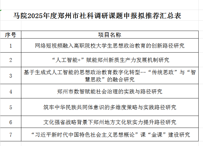根据我校《关于组织申报郑州市社科联2025年度调研课题的通知》要求,我院限报7项。经前期精心组织,广泛动员,马克思主义学院共收到11项申报书。经我院学术委员会评审后,拟推荐以下7项申报书作为我院2025年度郑州市社科联调研课题最终提交材料,名单如下: