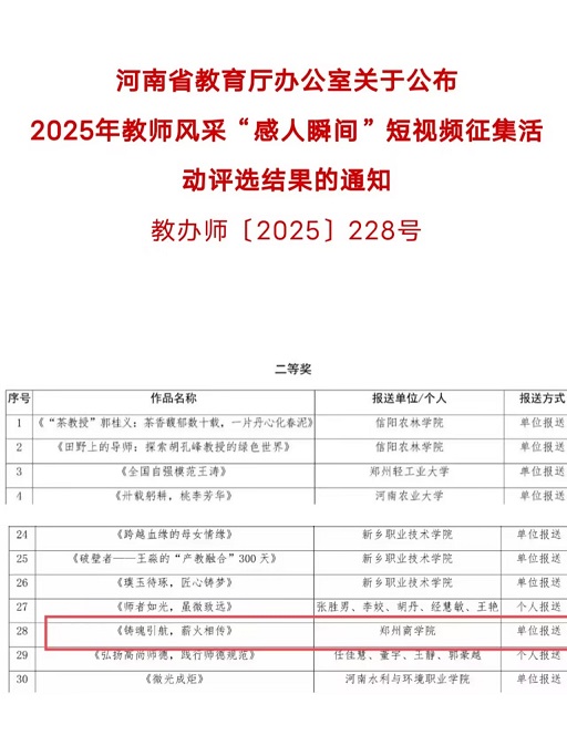 在第41个教师节前夕,河南省教育厅公布了2025年教师风采“感人瞬间”短视频征集活动的评选结果。我校推荐报送的作品《铸魂引航,薪火相传》短视频荣获二等奖,展现了我校教师坚守育人初心、深耕教学一线的敬业和担当。