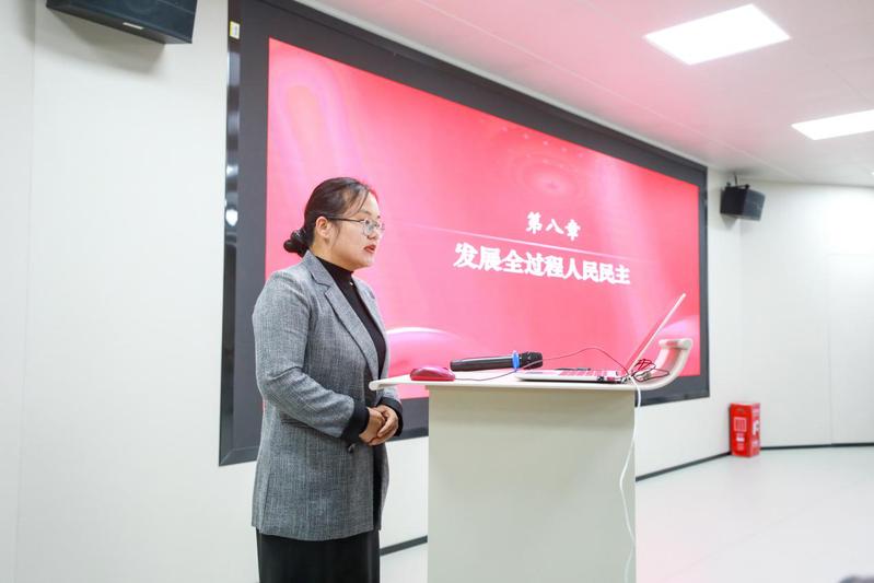 会上,马克思主义学院教授李义军以“党的二十届四中全会精神融入课程各章节的总体思考”为题进行阐述,系统梳理了全会精神的核心要义与课程体系的结合点,从制度建设、治理效能、法治保障等维度给出融入教学的思考。“习概论”课程教研室主任姚丹霞以“全过程人民民主”为题就如何将党的二十届四中全会精神融入第八章具体教学实践进行说课展示。她综合运用案例分析、数据支撑、政策解读等多元教学方法,为参会教师提供了可借鉴、可复制的教学范例。