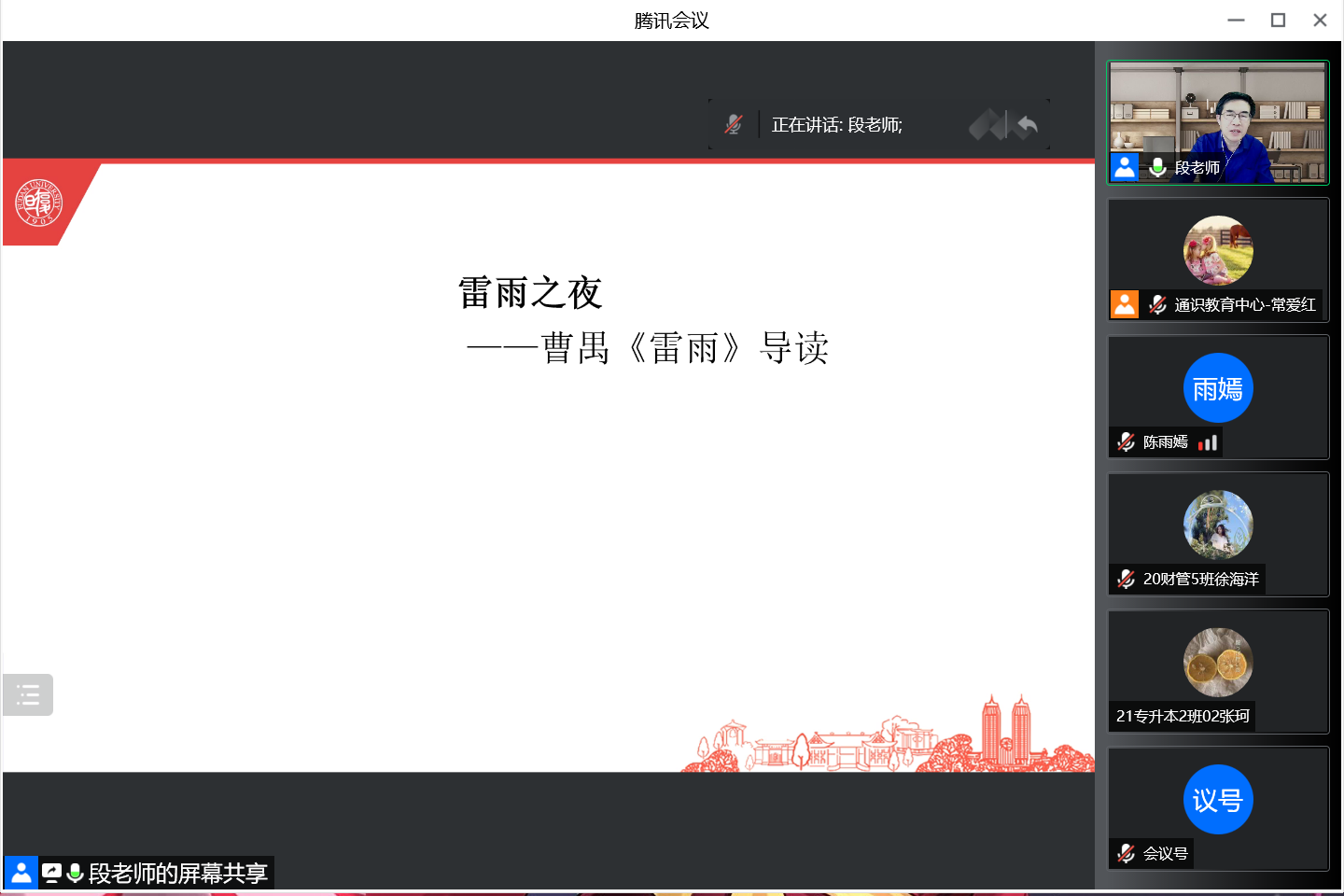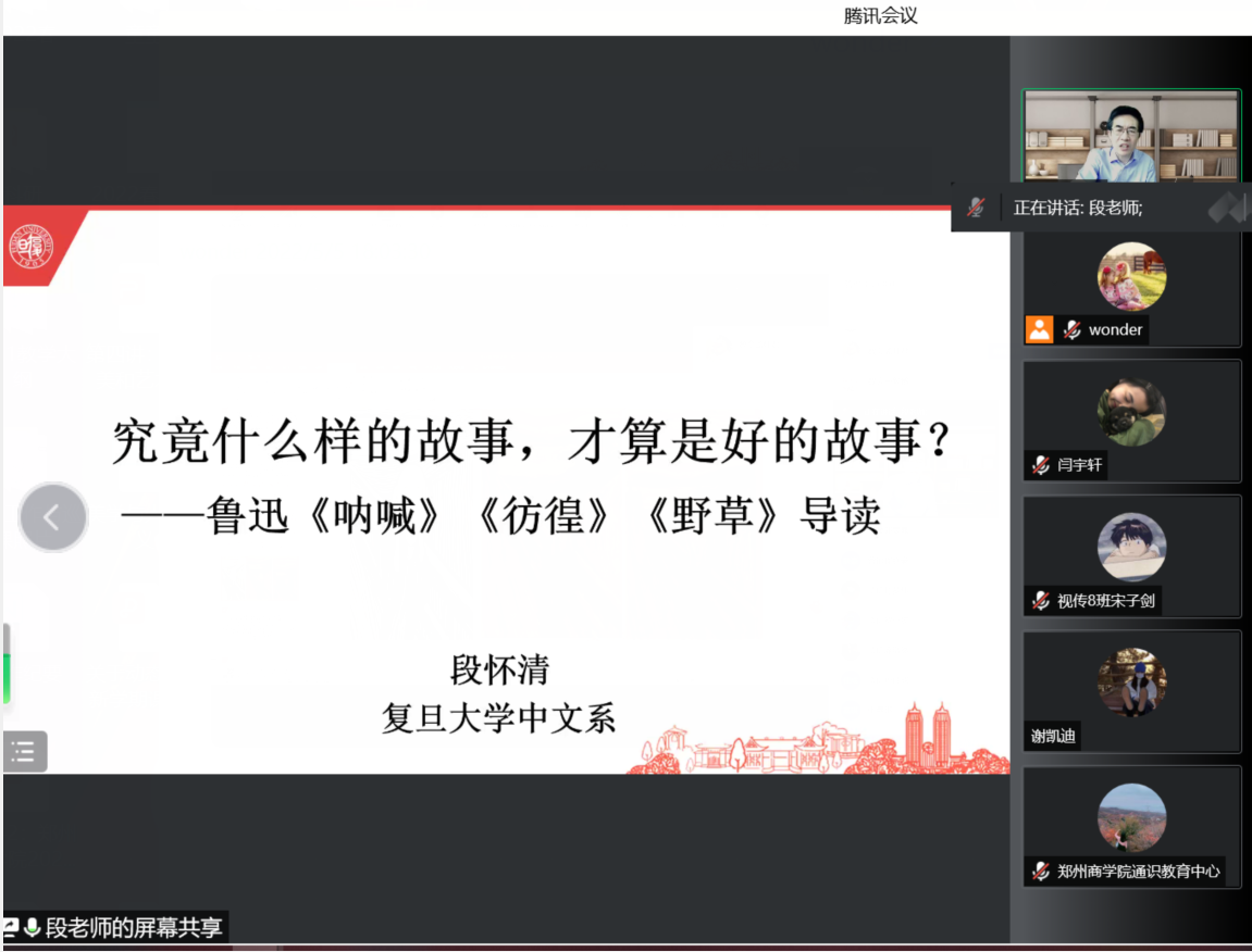为落实期初校领导讲话精神,提升通识教育质量,打造通识教育品牌,提升学生人文素养,通过文学经典导读课程培养学生经典阅读和独立思考的能力,引导学生通过阅读文学名著,达到启迪学智慧、涵养品格和润泽生命的目的,5月5日-7日下午,通识教育中心特邀复旦大学博士生导师段怀清教授于线上为我校师生讲授通识名师课程《中国现当代文学名著导读》,通识中心闫蕾蕾主任、王花磊书记和常爱红老师分别主持了三场讲座,共计近千名师生在线聆听。
