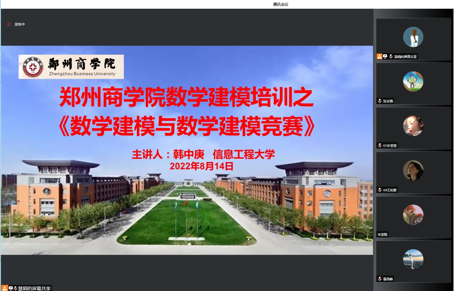 为更好的备战2022年全国大学生数学建模竞赛,通识教育中心于8月14日邀请信息工程大学韩中庚教授通过腾讯会议做有关暑期数学建模的线上专题讲座,我校2022年全国大学生数学建模竞赛的参赛学生、指导老师及对数学建模感兴趣的学生参加讲座。