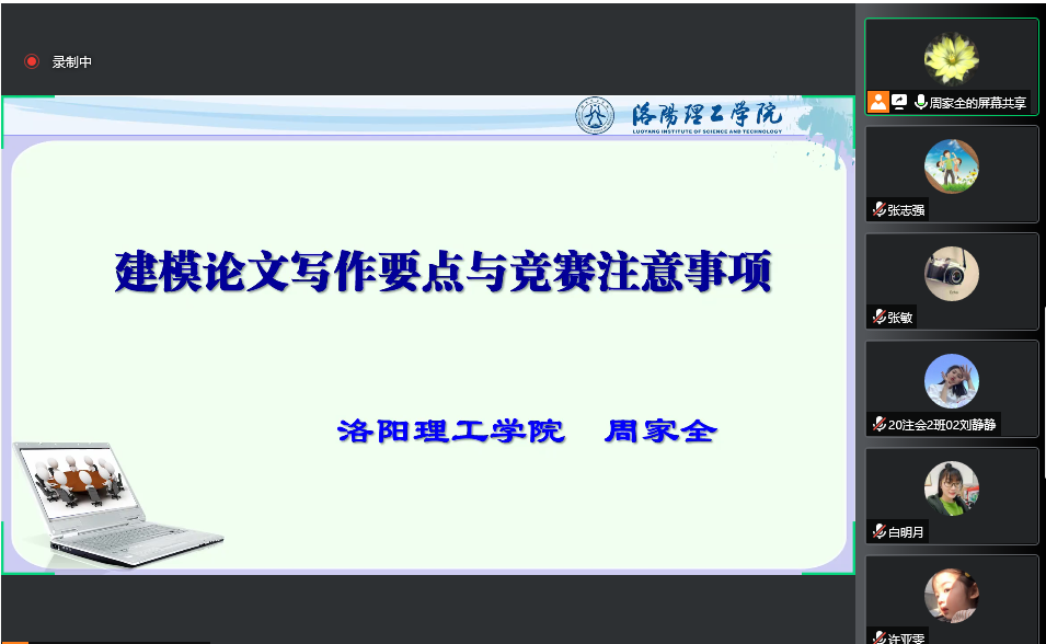 为全面备战2022年全国大学生数学建模竞赛,我中心于8月26日邀请洛阳理工学院周家全教授进行题为《建模论文写作要点与竞赛注意事项》的数学建模线上专题讲座,我校2022年全国大学生数学建模竞赛的全体参赛学生和指导老师参加讲座。