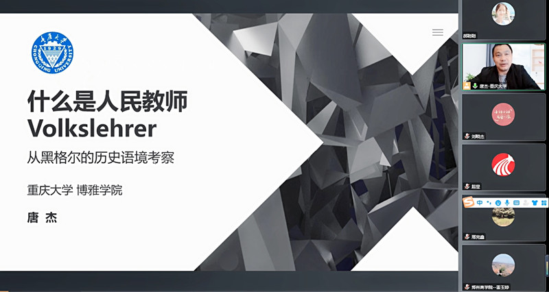 为提高我校通识课程建设质量、提升通识教育教学水平,进一步营造良好的学术氛围,打造通识教育品牌,形成协同育人氛围,促进培根铸魂、启智润心。11月24日晚上,通识中心特邀重庆大学博雅学院副院长唐杰博士做客通识名家讲堂第32期,通过腾讯会议直播,超星学习通平台转播的形式,进行了题为《什么是人民教师-从黑格尔的历史语境考察》的通识讲座,我校600余名师生在线参与。