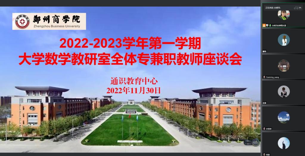 为了进一步规范全体专兼职教师线上教学,对近期线上教学出现的问题进行总结,并对下一个阶段的授课内容进行要求。大学数学教研室于11月30日下午通过腾讯会议召开了2022-2023学年第一学期全体专兼职教师座谈会,大学数学教研室全体专兼职教师参加了此次会议,会议由大学数学教研室主任白明月主持。