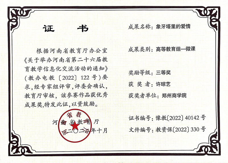 3月1日,从学校教师发展中心获悉,我中心教师马培兰参加由河南省总工会、河南省教育厅开展的2022年度全省教育系统教学技能竞赛,历经层层选拔、评审,获得了一等奖,并被授予“河南省教学标兵”称号。许琼艺老师的微课作品《象牙塔里的爱情》在“河南省第二十六届教育教学信息化交流活动”获得“高等教育组—微课三等奖”。