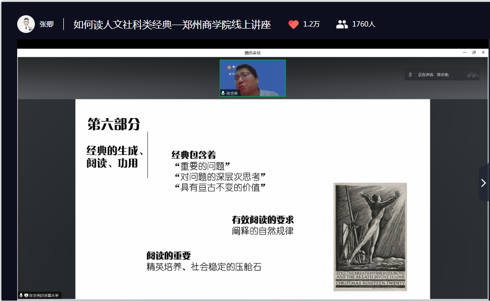 9月20日晚上,通识中心邀请河南大学博士生导师陈会亮教授作题为《如何阅读人文社科类经典》的线上讲座,我校约1760余名学生参与了本次讲座。本次会议由通识教育中心主任王花磊主持。