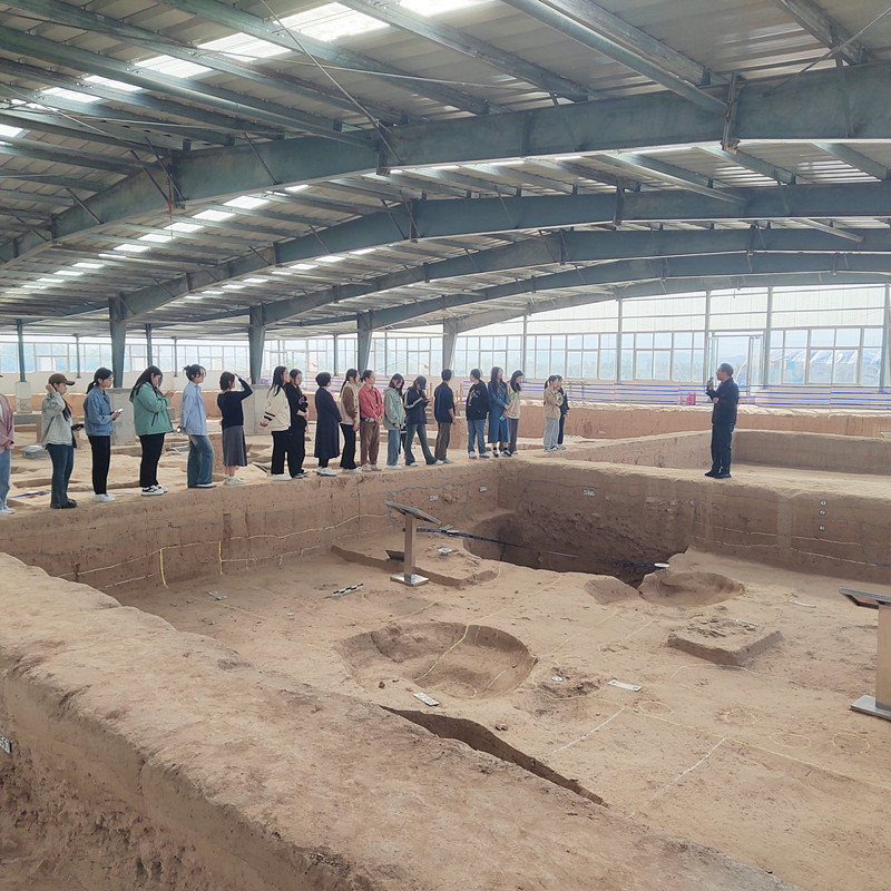 双槐树遗址发现的河洛古国遗存,先民聚落区域广大,都城规划严整,距今5300年。由于河洛古国遗存填补了华夏文明起源关键时期、关键地区的关键材料,在中华文明探源工程中占据极其重要的历史地位,被专家誉为“早期中华文明的胚胎”。双槐树遗址负责人张吉钦向师生介绍了遗址的基本情况,带领师生对考古点进行参观游学,向大家介绍了河洛古国的周边地理环境与都邑性城区建设布局,对遗址中发现的北斗九星、牙雕家蚕、三重壕沟、祭坛、瓮城等重要考古发现的作用与意义进行了详细的讲解,带领大家参观了遗址的重要点位。张老师精彩的专业讲解,引发了师生的阵阵掌声。