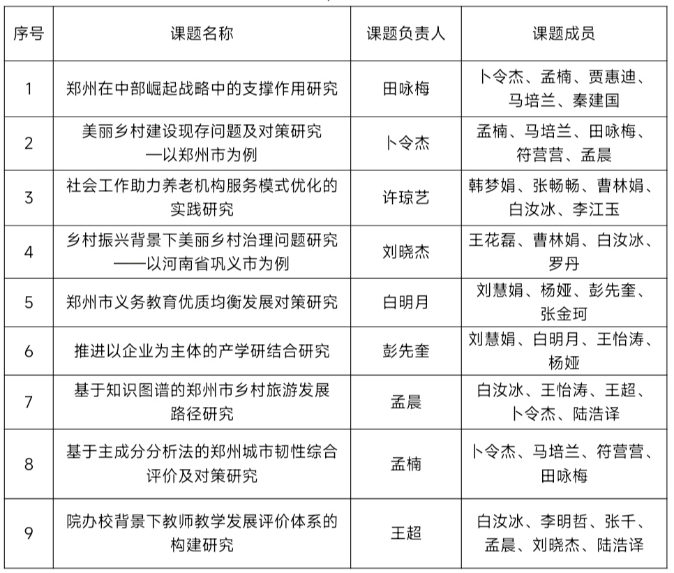 通识教育中心共有14人参与2024年度郑州市社科联申报,根据《999策略白菜手机论坛郑州市社科2024年度调研类课题申报通知》要求,经学院科研项目评审审查推荐小组对申报人员的申请书进行研究、论证、评议后,共推荐9人参与2024年度郑州市社科联项目的申报,名单公示如下: