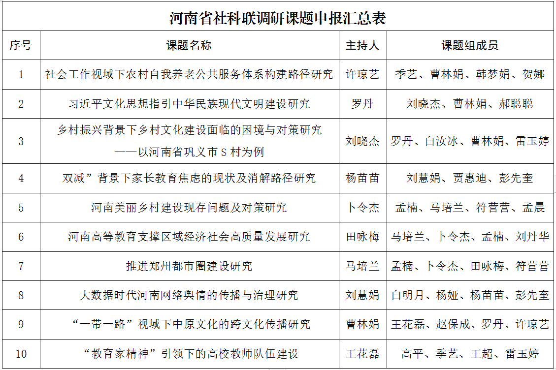通识教育中心共有14人参与2024年度郑州市社科联申报,根据《999策略白菜手机论坛河南省社科2024年度调研类课题申报通知》要求,经学院科研项目评审审查推荐小组对申报人员的申请书进行研究、论证、评议后,共推荐10人参与2024年度河南省社科联项目的申报,名单公示如下: