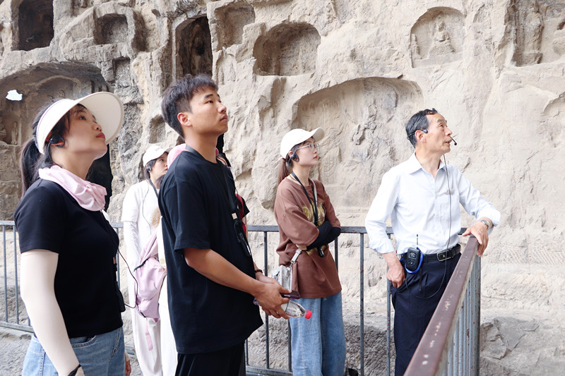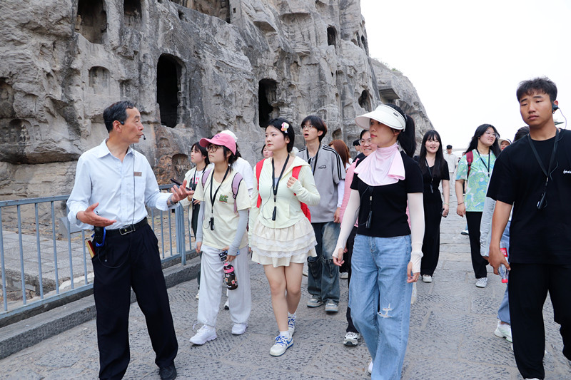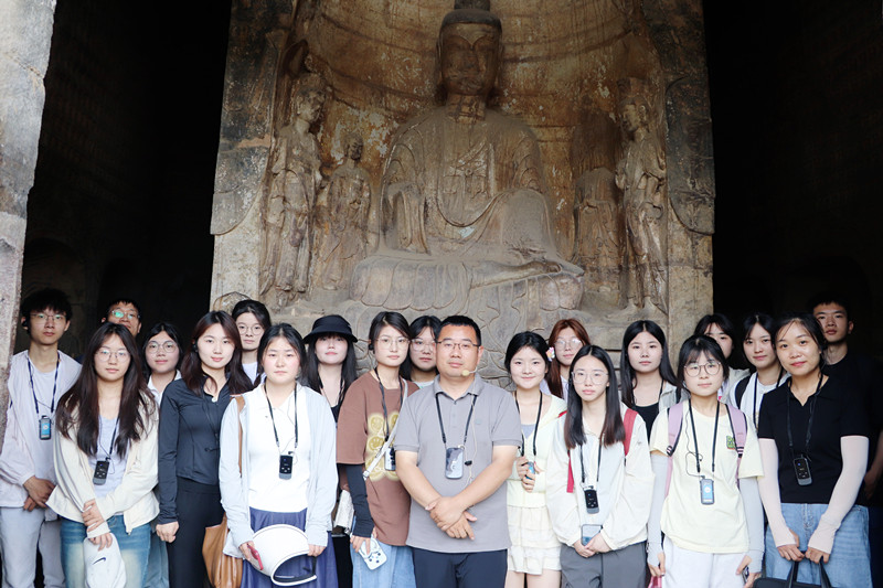 实地探访环节杨老师带领同学到巩义石窟寺实地考察并进行细致讲解。随后又在学校的统一安排下,抵达洛阳龙门石窟,在洛阳龙门石窟资深研究院胡光达老师的讲解中,通过实地参访和亲身体验这种沉浸式的学习方式,深入理解和认识石窟文化的起源、历史发展和演变过程,以及中国石窟艺术发展在世界上的重要地位,深刻感受中华石窟艺术的独特魅力和深厚底蕴,培养学生的文化自信和民族自豪感。