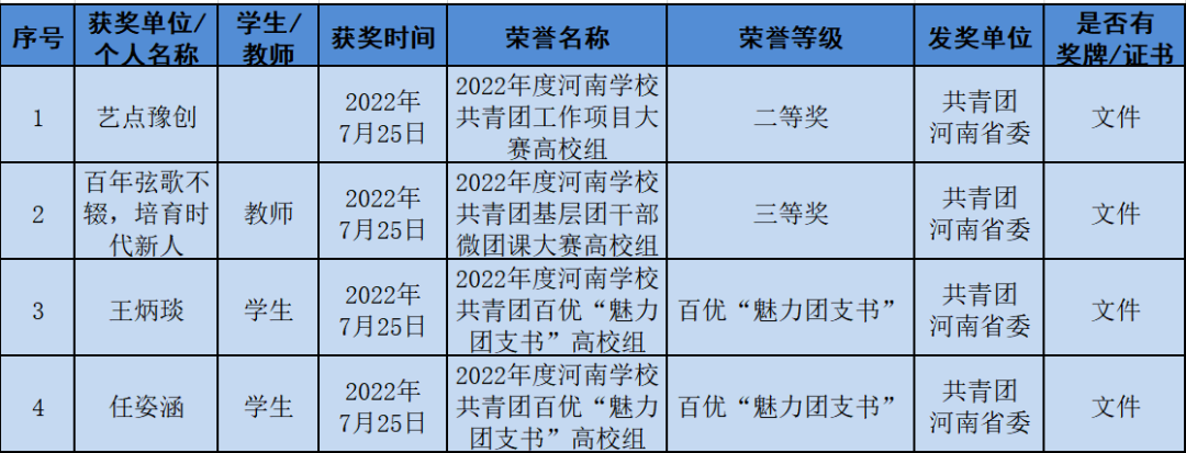 近日,共青团河南省委发布了豫青联字【2022】23号《关于公布2022年“挑战杯”河南省大学生创业计划竞赛优秀组织单位、获奖项目和优秀指导教师名单的通知》和豫青联字【2022】26号《关于发布2022度“活力杯”河南学校共青团基层基础工作大赛获奖名单的通知》中,我校均取得了优异成绩!