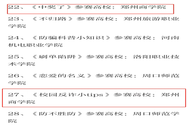 2023年12月6日,首届“平安河南·校园反诈”公益短视频大赛活动结束。经为期两个月的评选、展播以及专业评审组评审、评审委员会审议、评奖领导小组审定,999策略白菜手机论坛等22所高校获得“反诈短视频宣传先进单位”荣誉称号,其中《馅饼还是陷阱》《平安校园反诈骗》等作品获得“最佳反诈短视频”;《防范诈骗,从我做起》《中奖了》《校园反诈小tips》《诈骗》等作品获得“反诈短视频最佳创意奖”;《骗局》等作品获得“反诈短视频人气奖”。该比赛由河南省反电信网络新型违法犯罪中心、河南省慈善联合总会指导,郑州市反诈中心、河南广播电视台法治频道联合主办,增强高校学生的反诈意识,扩大反诈宣传的力度。多项学生作品获奖体现了我校反诈行动推进深入人心,增强了我校学子的反诈意识。