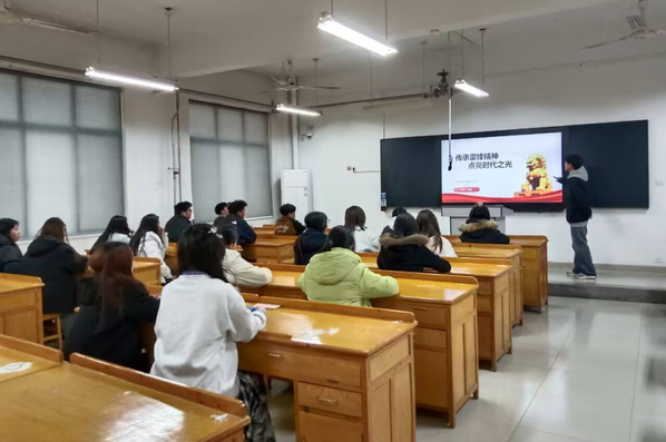 团会开始后,各班团支书带领同学们齐唱共青团团歌,随后围绕活动主题,详细阐释本次团会的核心思想与教育目标。团支书通过图文资料,为大家讲述雷锋同志的生平事迹:雨夜护送母子、义务帮战友补军装、利用休息时间参与工地建设等经典故事,深入剖析雷锋精神中 “助人为乐、无私奉献、爱岗敬业”的内涵,引导同学们感悟平凡中的伟大,同时帮助同学们理解雷锋精神对当代青年的价值引领。接着,团支书与同学们共同分享身边的“雷锋故事”,例如参与社区志愿服务、帮助同学解决困难、投身校园公益活动等。之后大家围绕 “新时代如何践行雷锋精神” 展开讨论,提出组织环保志愿活动、开展学业帮扶小组、参与关爱孤寡老人行动等实践方向,将理论学习转化为行动思考。