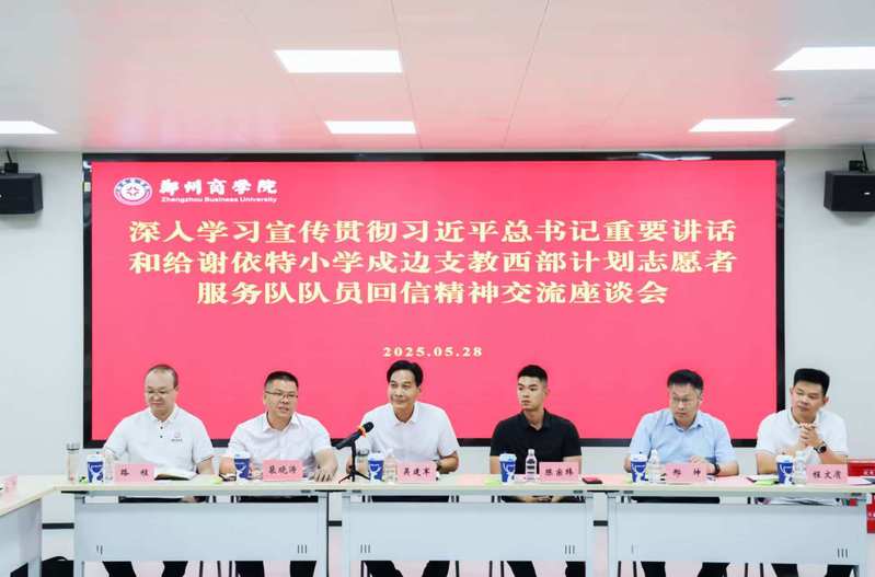 5月28日下午,我校举行深入学习宣传贯彻习近平总书记重要讲话和给谢依特小学戍边支教西部计划志愿者服务队队员回信精神交流座谈会。校党委书记吴建军、董事长助理陈宗纬、党委副书记兼纪委书记裴晓涛、党委组织部部长邢坤、党委宣传部部长程文质、党委学工部部长路程、各学院团委书记、辅导员代表、学生代表等参加会议。会议由校团委书记张鹏主持。