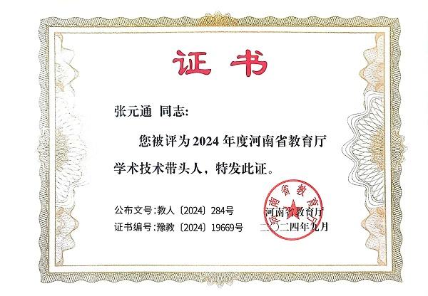 近日,河南省教育厅下发《河南省教育厅关于公布2024年度河南省教育厅学术技术带头人入选名单的通知》(教人〔2024〕284号),我院张元通同志荣获“河南省教育厅学术技术带头人”荣誉称号。