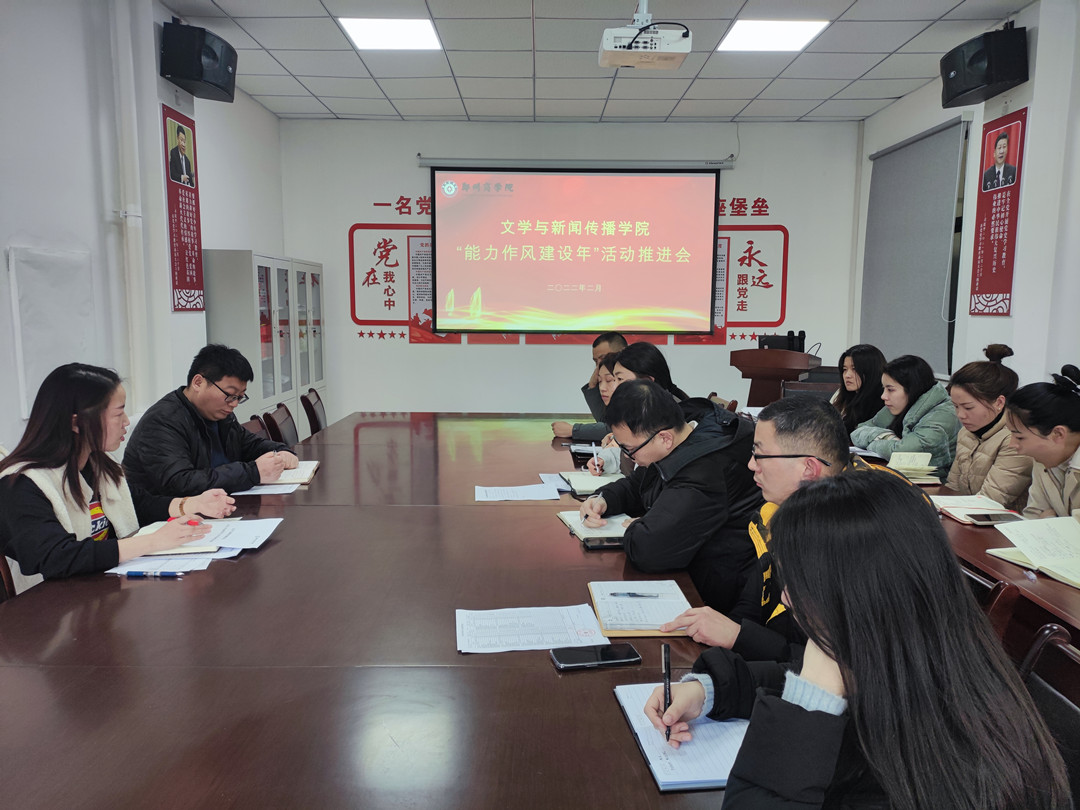 为贯彻落实省委和省委高校工委工作部署,2月24日下午,文传学院于自力楼101会议室召开“能力作风建设年”活动推进会,团委李洪洋书记和辅导员老师参加此次会议,会议由党委书记贾蓓主持。