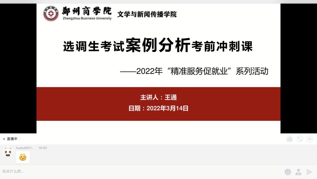 为促进我院学生实现更高质量、更充分的就业目标,3月14日晚,我院开启2022年“精准服务促就业”系列活动,本次主题为《选调生考试案例分析考前冲刺课》。