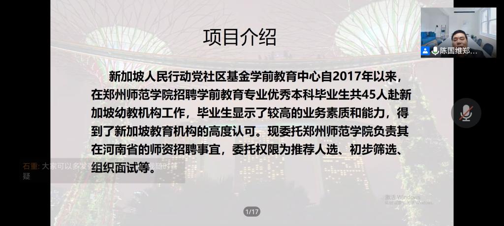 新加坡人民行动党基金会PCF幼儿园常年面向郑州师范学院进行招聘,本次陈教授也主动和我院联系,为我院学前教育专业提供招聘机会,为我院学前教育专业毕业生提供高质量就业岗位。