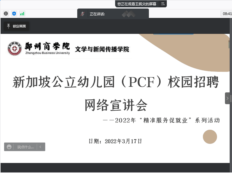 3月18日晚,我院组织开展2022年“精准服务促就业”系列活动第二场,新加坡公立幼儿园(PCF)校园招聘网络宣讲会,我院全体2022届学前教育专业毕业生参会。