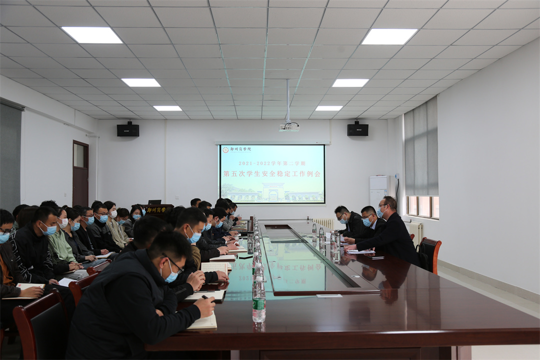 3 月 31 日上午,2021-2022 学年第二学期第五次学生安全稳定工作例会在文传学院自力楼 216 会议室召开。校党委副书记兼纪委书记裴晓涛,学务长路程出席,各学院分党委书记、学务处各科室科长、文传学院全体辅导员等参会。
