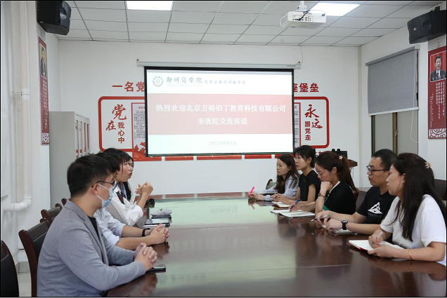 9月7日上午,北京万裕伯丁教育科技有限公司王欣奕老师一行到我院洽谈合作,我院党委书记贾蓓,就业专员王凯文及毕业班辅导员老师参加了交流座谈会,会议由王凯文老师主持。